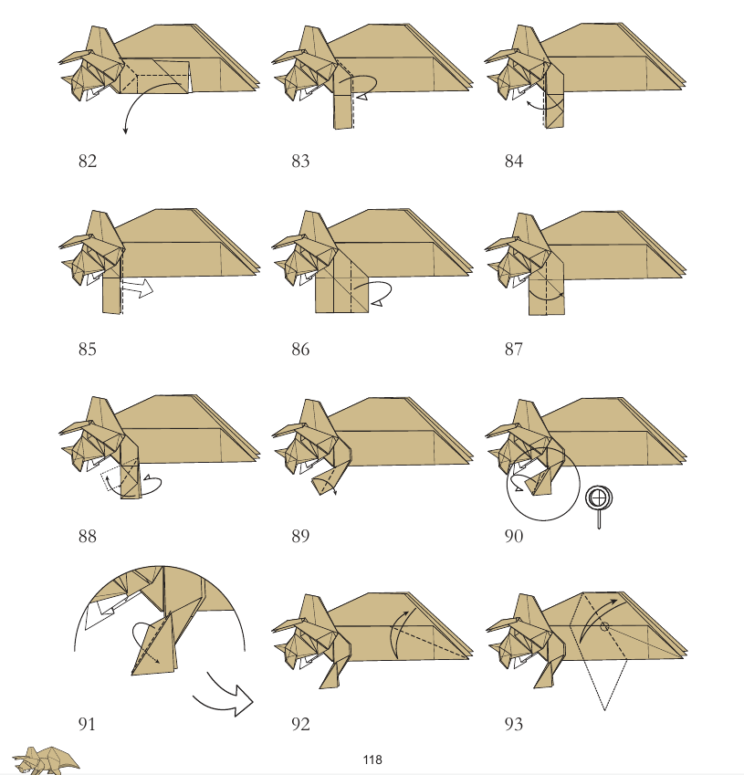 I have been folding Meng Weining's Triceratops from Origami Moments and have nearly finished, but this one fold is really giving me trouble. Can anyone help me with this sequence for the first leg? Specifically 83-85.
