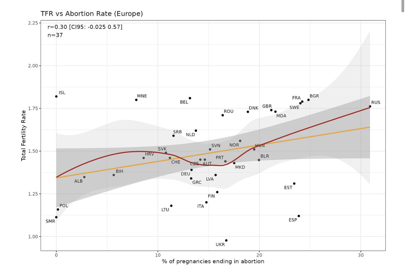In Europe, countries with higher abortion rates have higher fertility rates.Doesn’t appear that more conservative social policy is having one of its main intended effects.