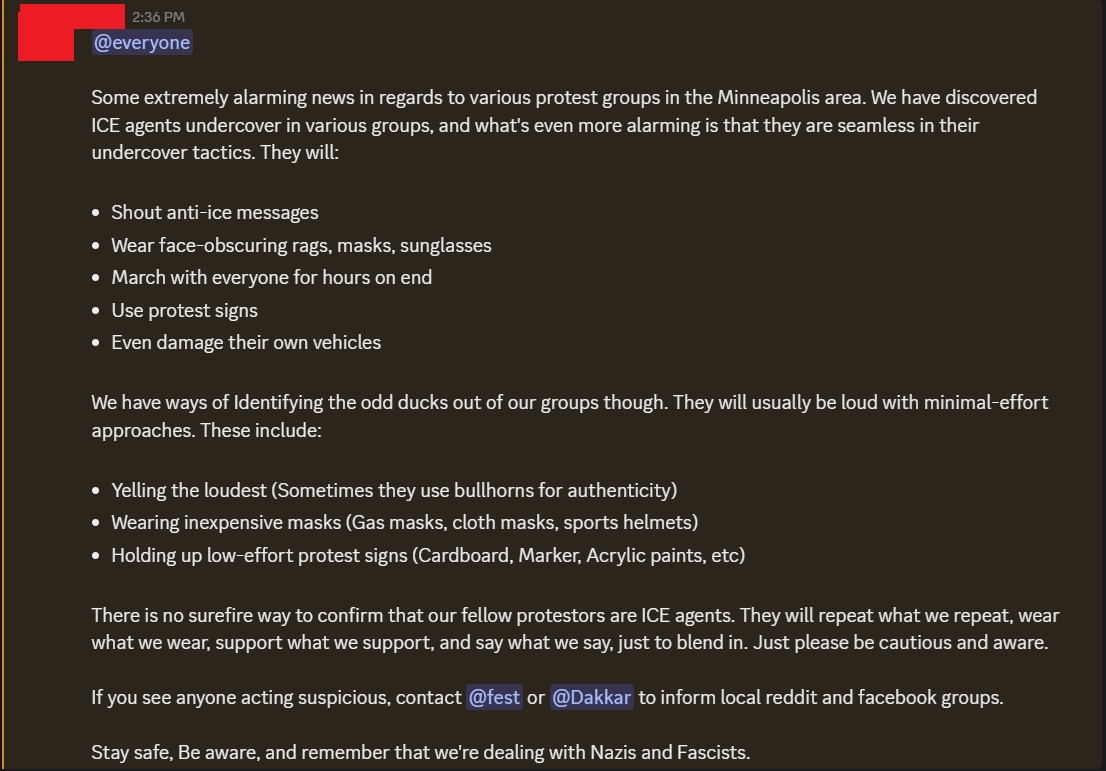 >Some extremely alarming news in regards to various protest groups in the Minneapolis area. We have discovered ICE agents undercover in various groups, and what's even more alarming is that they are seamless in their undercover tactics>There is no surefire way to confirm that our fellow protestors are ICE agents. They will repeat what we repeat, wear what we wear, support what we support, and say what we say, just to blend in. Just please be cautious and aware.