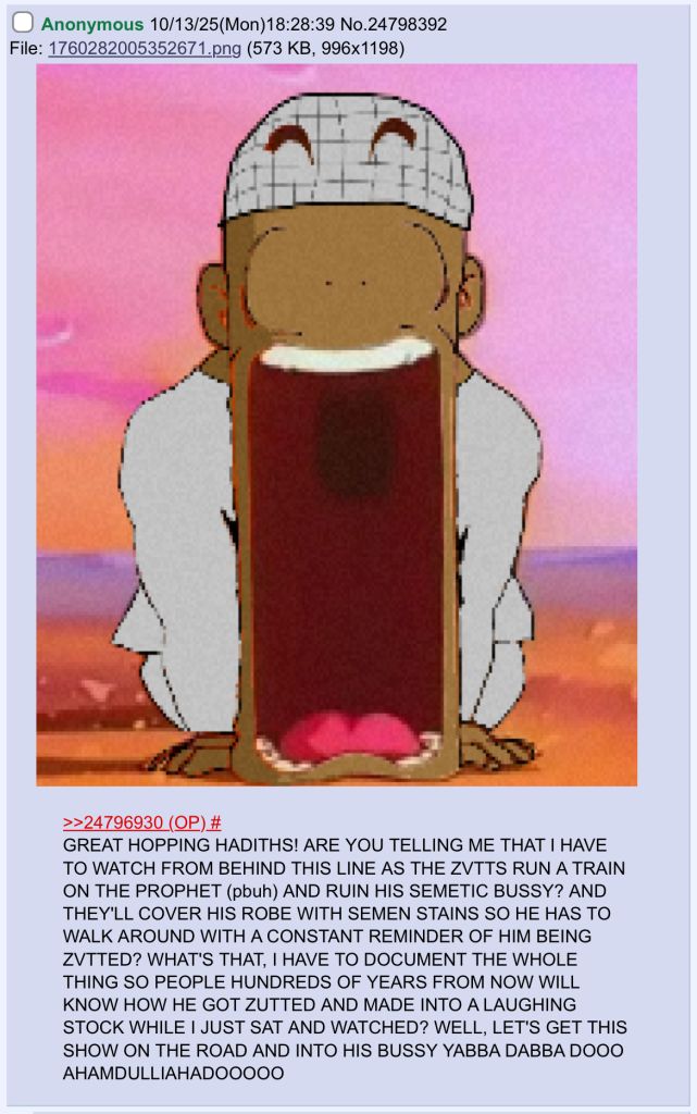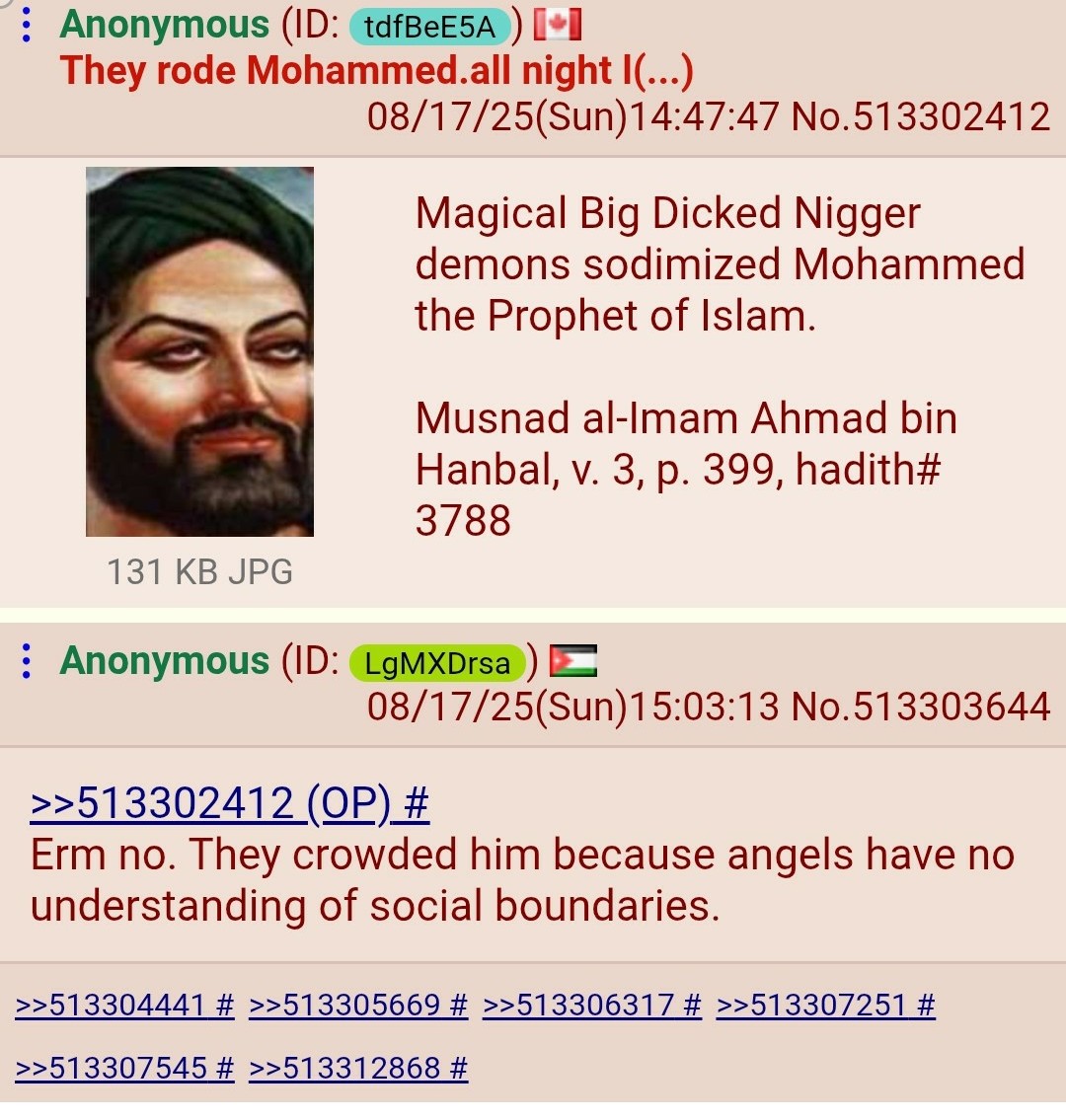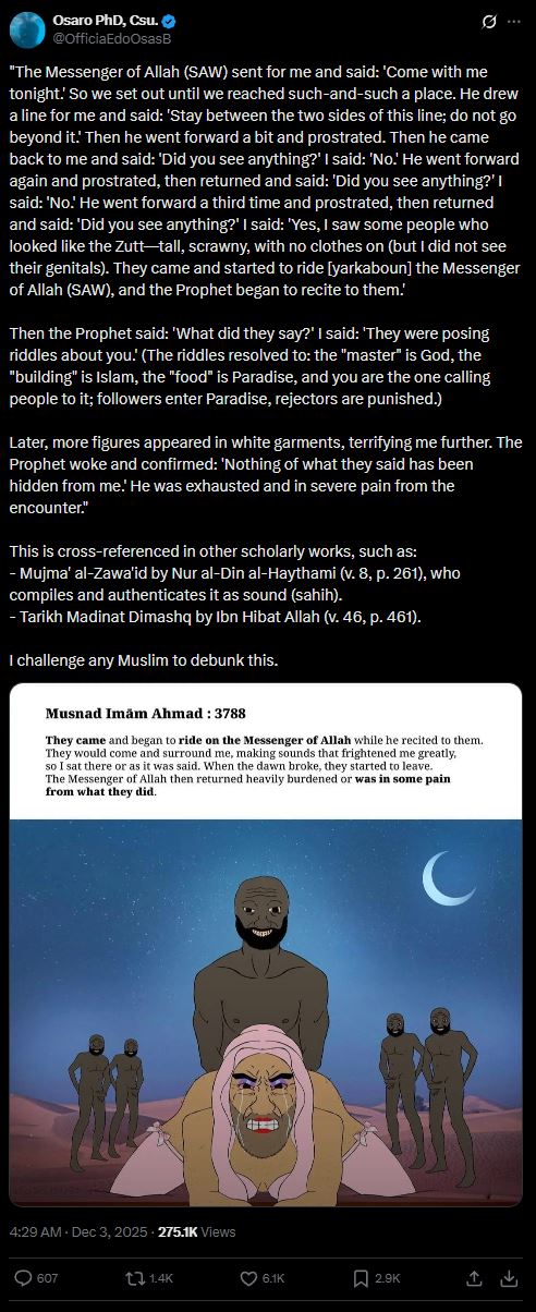 GTFIH Muhammad was unironically raped by Indian Jats per official Islamic hadiths!https://x.com/OfficiaEdoOsasB/status/1996149838635733478""The Messenger of Allah (SAW) sent for me and said: 'Come with me tonight.' So we set out until we reached such-and-such a place. He drew a line for me and said: 'Stay between the two sides of this line; do not go beyond it.' Then he went forward a bit and prostrated. Then he came back to me and said: 'Did you see anything?' I said: 'No.' He went forward again and prostrated, then returned and said: 'Did you see anything?' I said: 'No.' He went forward a third time and prostrated, then returned and said: 'Did you see anything?' I said: 'Yes, I saw some people who looked like the Zutt—tall, scrawny, with no clothes on (but I did not see their genitals). They came and started to ride [yarkaboun] the Messenger of Allah (SAW), and the Prophet began to recite to them.' "Zutt people = Indian Jats