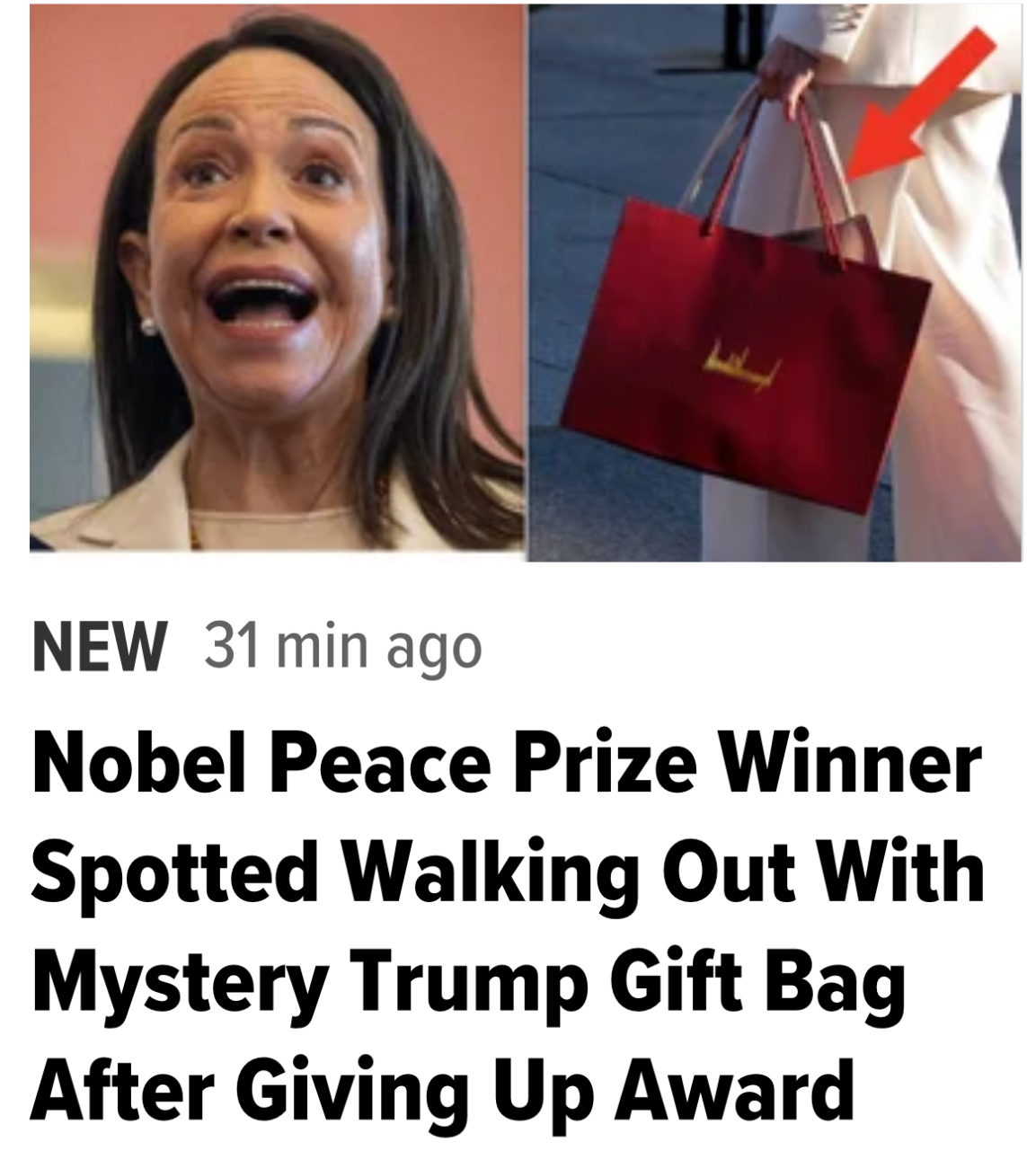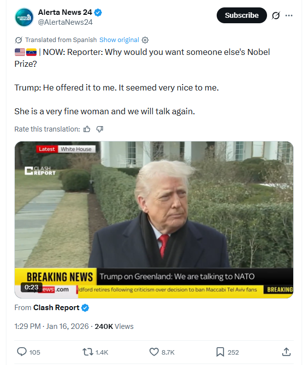 NOW: Reporter: Why would you want someone else's Nobel Prize?Trump: He offered it to me. It seemed very nice to me.She is a very fine woman and we will talk again. 1/16/2026https://x.com/AlertaNews24/status/2012230826835005756 1/16/2026 https://files.catbox.moe/o37efz.mp4