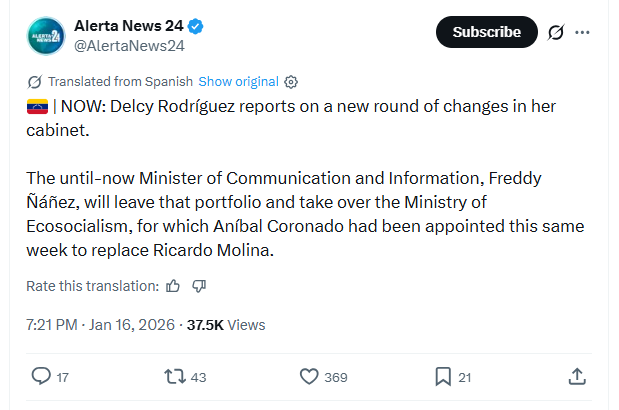 NOW: Delcy Rodríguez reports on a new round of changes in her cabinet.The until-now Minister of Communication and Information, Freddy Ñáñez, will leave that portfolio and take over the Ministry of Ecosocialism, for which Aníbal Coronado had been appointed this same week to replace Ricardo Molina. 1/16/2026https://x.com/AlertaNews24/status/2012319355959193713