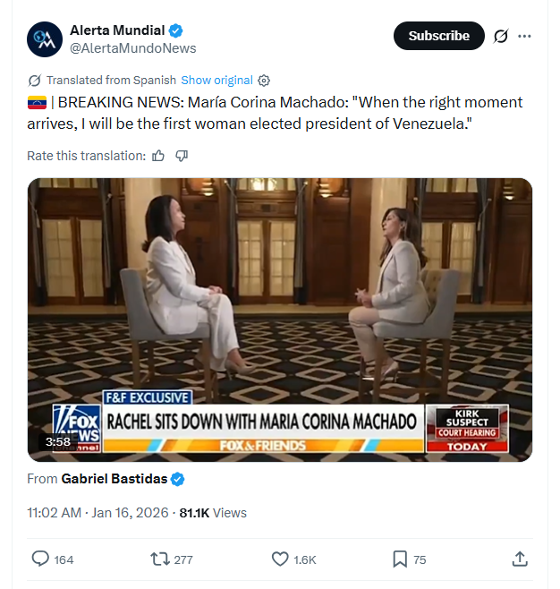 BREAKING NEWS: María Corina Machado: "When the right moment arrives, I will be the first woman elected president of Venezuela." 1/16/2026https://x.com/AlertaMundoNews/status/2012193780519010793 1/16/2026https://files.catbox.moe/dacusv.mp4