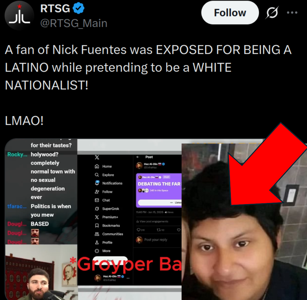 >be Groyper>spend all day talking about demographic replacement>only to end up becoming said demographic replacement:>Christian-Muslim alliance >Latino ZoomersAnd even when there is a lone white guy… >he's just there to get raped by the brown indian epsteinite Seriously /pol/, how did we get here? Even the Hinkle/Haz crew—who the groypers call "subversive commies"—look like they belong in a 1950s ford factory. Some of them are even founding old stock. Does Nick believe leading an army of brown people translates into Aryan victory. I really don't get it?