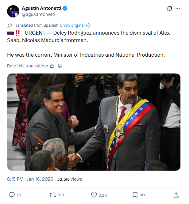 URGENT — Delcy Rodríguez announces the dismissal of Alex Saab, Nicolas Maduro’s frontman.He was the current Minister of Industries and National Production. 1/16/2026https://x.com/agusantonetti/status/2012332851002216795
