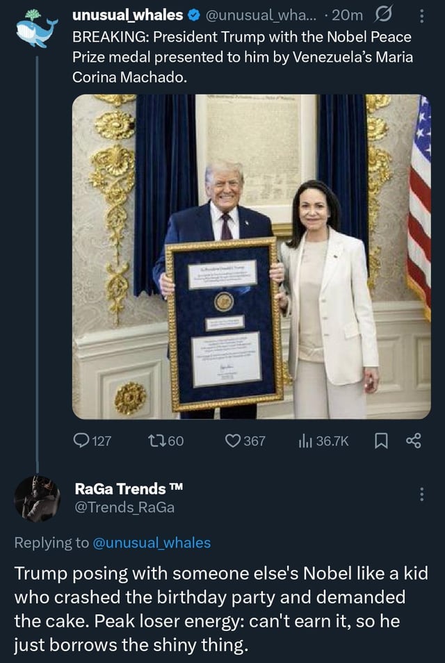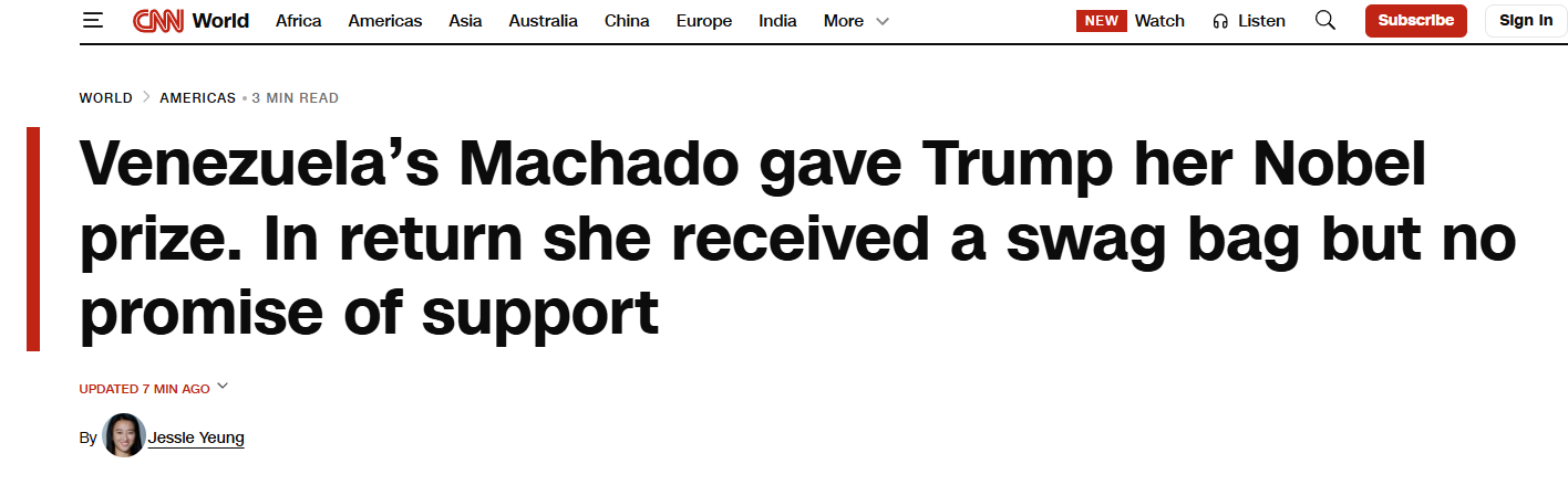 Machado finally receives payment for giving Trump the Nobel Peace Prize.