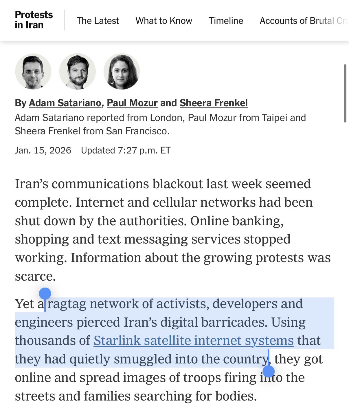 LET THAT SINK IN... https://www.nytimes.com/2026/01/15/technology/iran-online-starlink.html