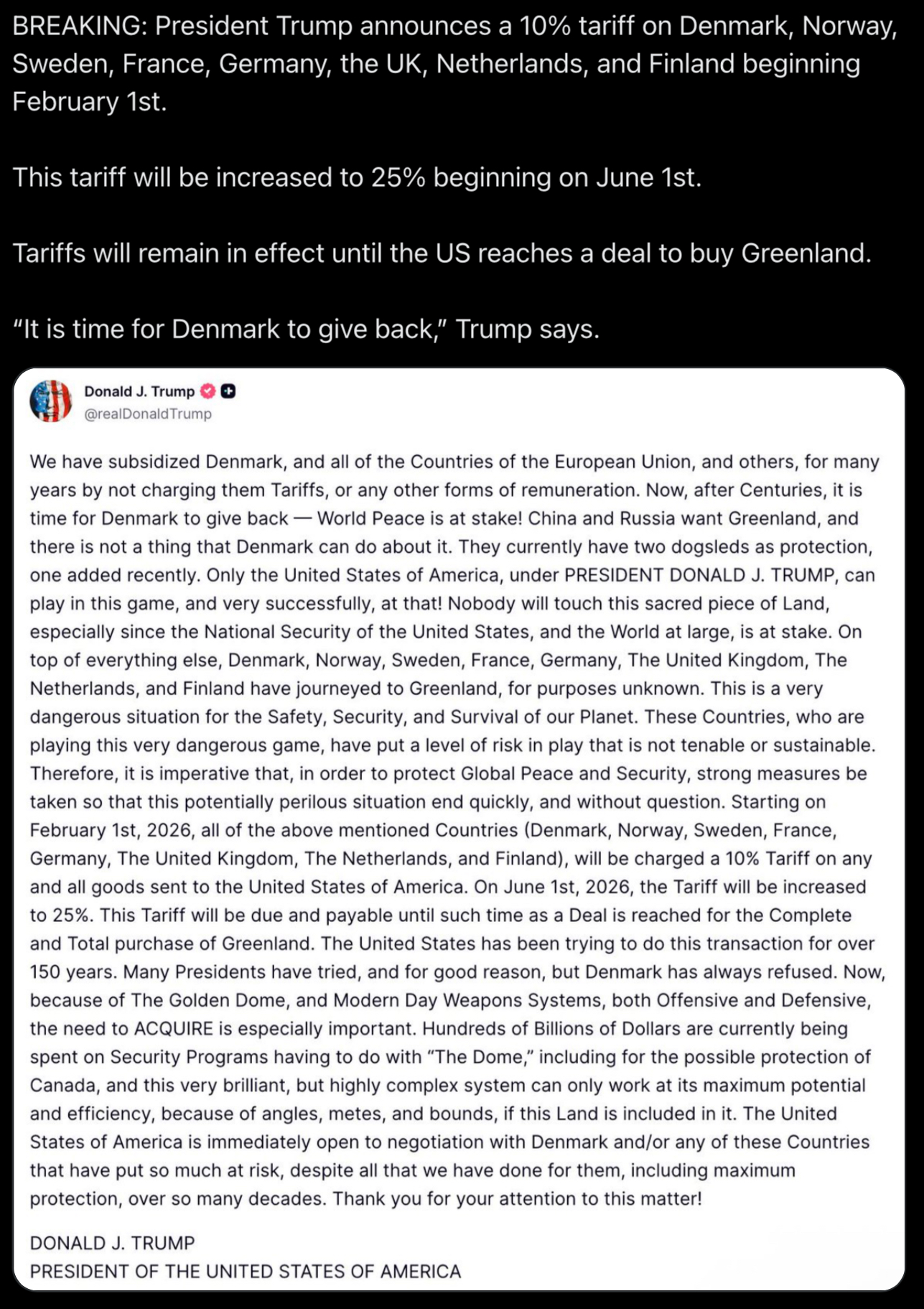 Because the development of AI works better in colder climates, because it is better for bunkers if a great war happens, and because of natural resources.An incapable country when it comes to bigger geopolitical matters, like Denmark, should let the USA take Greenland or pay tariffs to the USA. In the end, many European countries will pay the price for the USA to get Greenland.We will see bad cop and good cop politics in the news, but in the end the USA, Republicans and Democrats alike, will get Venezuelan oil and Greenland and will become a richer and more powerful country.Democrats will pretend to be against it, but they will not give Venezuelan oil back and will not give Greenland back.In the same way, Hollywood, which is largely owned by Democrats, does not make movies against Israel, which has been killing Palestinians for more than half a century and bombing Palestinian children, men, women, elderly people, schools, and hospitals.Hollywood only makes movies about Nazis, but not against Israel.