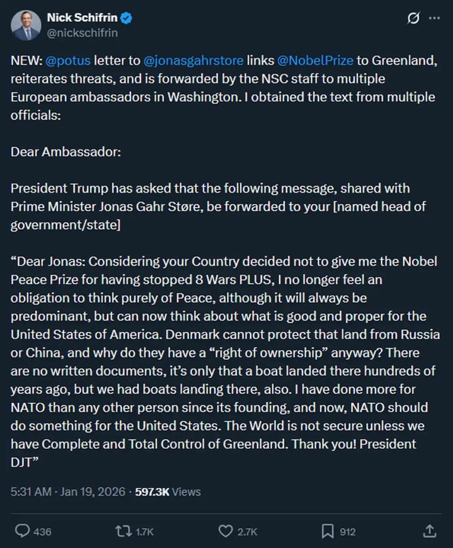 >>526409677the important thing here is timing. the greenland talk started right after maduro. so by floating the greenland offer, trump shut down all discussion about the legality of arrest maduro, and now it is like that never happened. meanwhile we are sitting on venezuelas oil. masterful manipulation of the media environment. this is trumps greatest skill. make people hate him and then use their emotions to control them and make them do what he wants. it is obvious, and he does it over and over again, and yet somehow they have no counter to it.