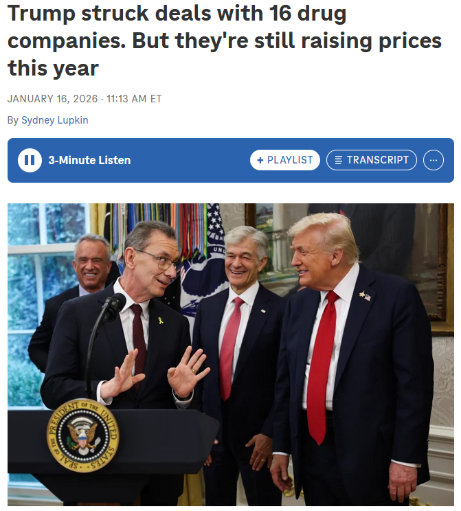 lmao>The agreements, nicknamed "most favored nation" deals, were aimed at getting lower prices for American consumers and pushing other wealthy countries to pay higher prices for new drugs.>But drug companies, including the 16 that made deals, raised the prices of 872 brand-name drugs in the first two weeks of 2026, according to a new analysis by 46brooklyn, a drug price research firm.>The drugs with price hikes included medicines to treat cancer, heart failure and Type 2 diabetes. The price of some COVID shots also went up.https://www.npr.org/2026/01/16/nx-s1-5678915/trumprx-pharma-drug-price-deals-list-prices