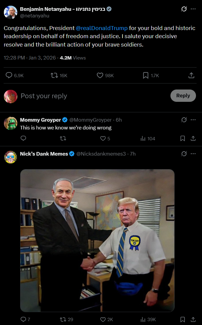I didn't think it was possible for you people be perceived even worse in my eyes, but you managed to do this with your reaction to the Trump administration's new regime change in Venezuela.After a year of listening to you defend pedophiles, and the Epstein cover-up, I didn't think there was any way you could alienate me more, on a visceral level. But hearing you gloat about knocking off one of the poorest and most vulnerable countries, for no real reason other than "they're not letting billionaires profit off of their oil", you managed to make me hate you even more.