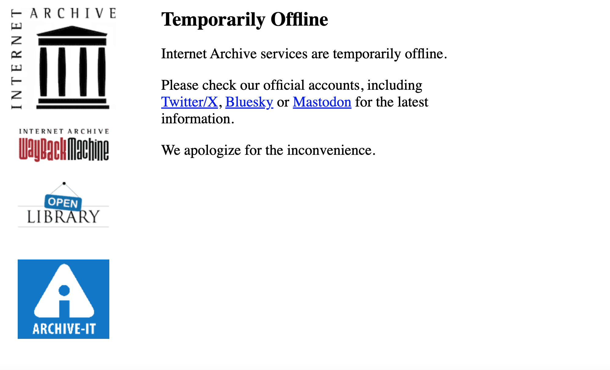 Some one has taken down the Internet Archive again most likely to remove some books or other media that was available to the public on there for free.