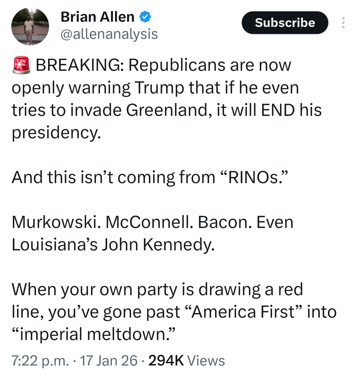>>526295410>this isn't coming from RINOs...>proceeds to list stereotypical RINOs>Murkowski, McConnel, etcI know twitter is for braindeads, but how is anyone this politically illiterate?