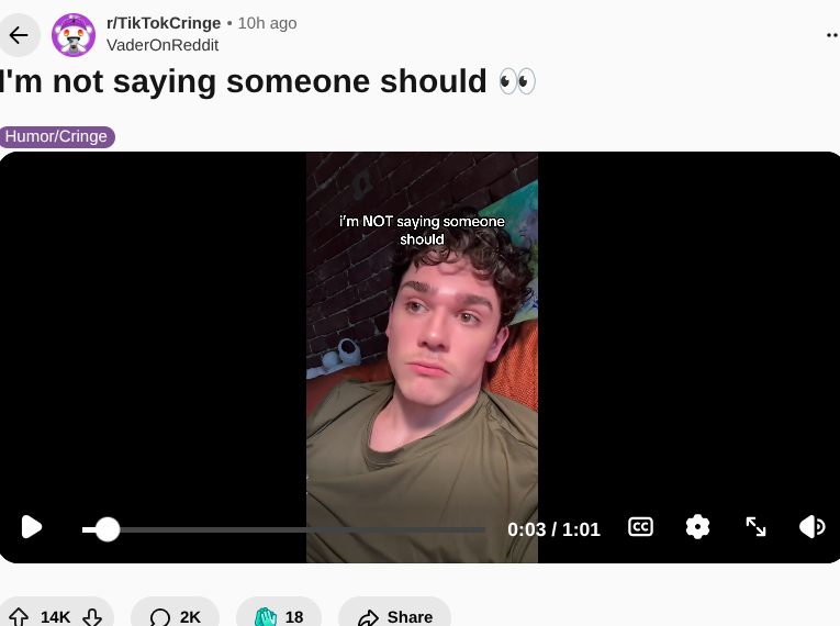 Read the comments its obvious what they're all talking about and right now this is the 3rd top post on all of reddit.https://www.reddit.com/r/TikTokCringe/comments/1qfto07/im_not_saying_someone_should/Reddit is a terrorist organization.
