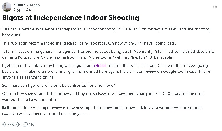 Tranny goes into a shooting range, uses the wrong restroom, owner confronts him. Tranny goes on Reddit to cry about it and review bomb Google / Yelp. Owner makes cuck statement about serving anyone regardless of degeneracy but takes a firm stance on restroom usage.reddit.com/r/Boise/comments/1qdwlmc/bigots_at_independence_indoor_shooting/