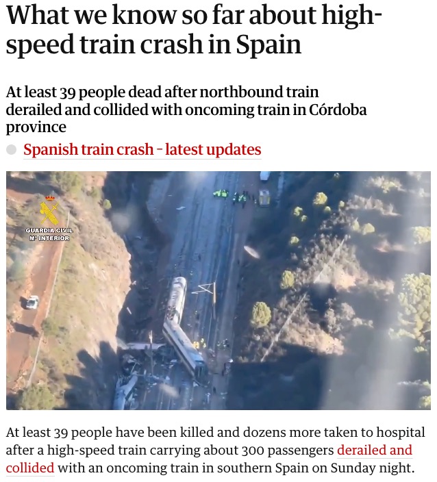 Spain recognizes Palestine, next thing you know a high speed train collides with another high speed train.This occurs at the one place that a train could derail with no time to avoid a collision with an oncoming train. What are the chances?