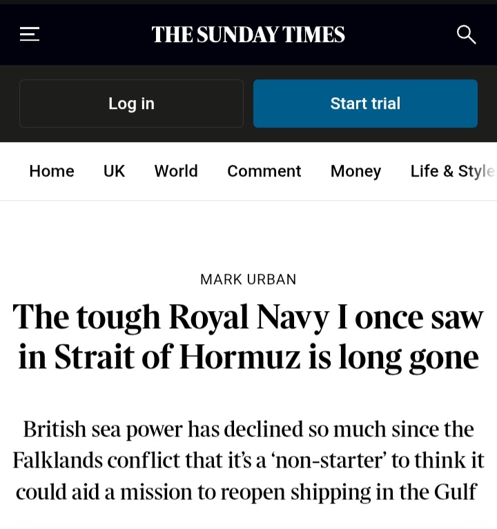 Mark Urban, a renowned British military expert, just published his piece in the Times, explaining in detail why the UK cant help the US in Hormuz even if it was fully determined to do this.https://www.thetimes.com/uk/defence/article/strait-hormuz-reopen-royal-navy-sfphbgns5The Royal Navy has collapsed since 1987: from 50 destroyers/frigates, 21 submarines and 3 carriers to just 13 large surface ships, 9 subs and 2 carriers today. Type 45 destroyers and Astute-class subs suffer chronic technical failures - some have not been to sea for years. A 17-year gap in frigate orders means the fleet risks sudden mass obsolescence.Royal Fleet Auxiliary support has shrunk from 22 ships (Falklands era) to only 2 operational, crippling sustained operations. Readiness is dire: far below 1980s levels, with maintenance backlogs and infrastructure failures. A senior officer calls UK participation in any Hormuz reopening mission "a non-starter". Britain is also failing its NATO duties in the North Atlantic/GIUK gap, leaving the alliance looking like a "paper tiger". Even the Trident force is "hanging on by our fingertips".Thats why Trumps administration is absolutely right when it describes NATO as an useless paper tiger. Thats just claiming hard facts xD