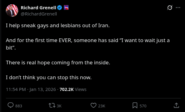 thoughts on Trump's department to bring iranian fags to your neighborhood, burgers? do you agree or disagree?>https://x.com/RichardGrenell/status/2011210396980691236