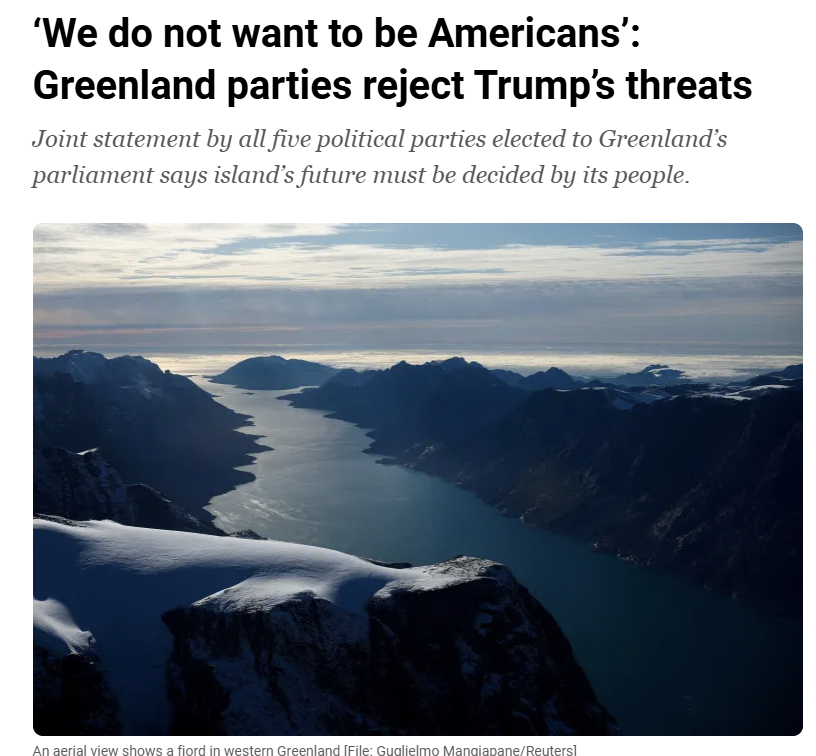 GREENLAND REJECTS USA>Greenland’s political parties have rejected United States President Donald Trump’s repeated threats to take control of the Arctic island, saying that its future must be decided by its people.>“We emphasise once again our desire for the US contempt for our country to end,” the leaders of all five political parties elected to Greenland’s parliament said in a joint statement late on Friday.>“We do not want to be Americans, we do not want to be Danes, we want to be Greenlanders,” they said in the statement, posted on social media by Greenland’s Prime Minister Jens-Frederik Nielsen.>“No other country can meddle in this. We must decide our country’s future ourselves – without pressure to make a hasty decision, without procrastination, and without interference from other countries,” the statement added.