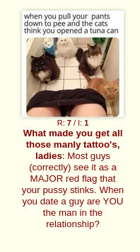 >>525889917It means her pussy stinks. Ever notice how dudes who go with tatted up gals always play the role of the bitch? It's almost like these types of stupid cunts drag their poor beta male in denial bfs around on some invisible leash, barking orders like a 4 ft tall drill sgt. The beta boyfriend obeys, but always with a dissolute air of:>“I could strangle this bitch” as he carries out her instructions. Pussy whipped no standards sack of shit.