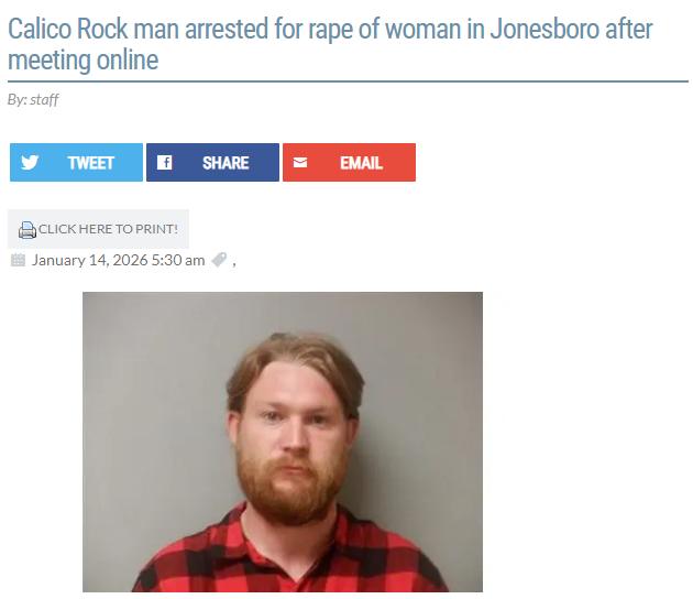 Crazy>A man from Calico Rock has been arrested on a rape charge in Jonesboro. Twenty-nine-year-old Terry Nicholas Mitchell was arrested last week and booked into the Craighead County Jail on the class Y felony.>According to the probable cause affidavit from the Jonesboro Police Department, detectives met with the victim at the hospital who said she had been communicating with Mitchell for about three weeks after meeting him online. She had been traveling near Calico Rock Dec. 20 and invited Mitchell to go back to Jonesboro with her.>That night Mitchell asked to sleep in the victim’s bed, which she agreed to, but she said there would be no sexual contact. She later awoke to Mitchell inappropriately touching her. She pushed him away, told him “no” and went back to sleep.>She was awakened a second time to the rape occurring. The victim pushed Mitchell away, yelled for him to leave and went into the living room. Mitchell followed her and apologized for his actions.>Video evidence from inside the victim’s home corroborated her story of Mitchell following her to the living room and apologizing.https://www.ktlo.com/2026/01/14/calico-rock-man-arrested-for-rape-of-woman-in-jonesboro-after-meeting-online/