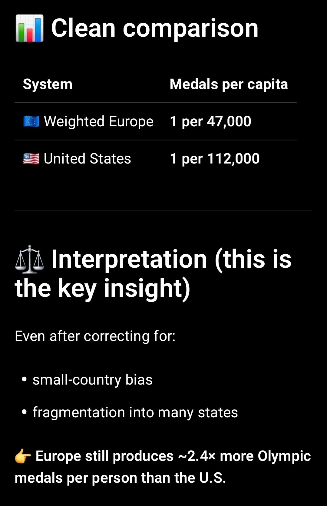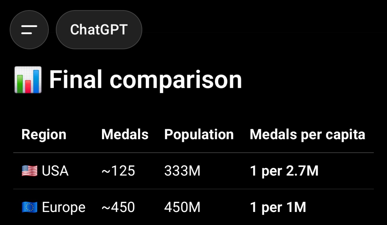 >>532525356Burger anon, i actually understand your point and you're not exactly wrong in your logic but the problem is you starting assumption: you speak of chance which, if this was a lottery thing as your example, you would be correct. Except this is about performance. Here's a dumb example to open your mind: if there is a boxing competition, mike Tyson VS all middle schoolers of America, who wins? And does it matter that you have 1 vs 20, 4000 or 6 million? So by the same token having 1 competitor V 20 (or however many eu countries), if he is the best at the competition, it really doesn't matter how many people he competes against.Alternative 2, even if Europe had it's own "pre-olympics olympics" and only sent the winners to compete against the US, it would still be the best of the best, meaning the end result US v everyone else. To reconnect to the mike Tyson example: does it matter that he boxes against 40 middle schoolers one after the other or would the result be different if he only boxed the best middle schooler of the 40?