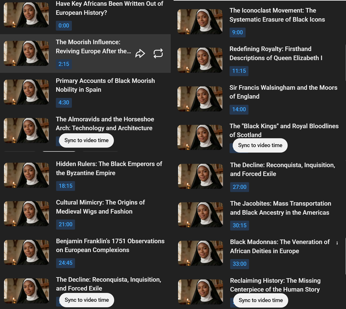 >>532324395Have a look at this, this popped up in my feed, and admittedly I clicked it because it had a white guy who looked like he was talking in the thumbnail, so I thought it was going to be a liberal kneeling to blacks or something. Actually it's an AI video claiming Scottish nobility, Elizabeth I, the renaissance, jacobites, classical liberalism in the USA, byzantine emperors were all crypto-blacks or the hidden strings were pulled by them while an AI black guy pretends to watch (to train the chimps at home with positive feedback). The channeel has 245k subs. Just look at these vid chapters.This isn't being done by black people. It's some hasbara side project targeting them. It is very similar to the CI/We wuz jews stuff that is being pushed online in various circles that ties in Aryan migration patterns to jewish tribes. Jews love starting these weird cargo cults. They systematically grant every European achievement to hidden black influencers and every failure is the European's. in fact, I'm going to DL this vid to archive it as it suddenly became unlisted.There was a popular black influencer who got posted here who was into all of this pharaoh shit called Young Pharaoh, he said he got into it as a child when he went into his uncles home and he had all of this pharaoh paraphenalia there, then became obsessed with it. That would have been decades ago. It's an old psyop being pushed since the 60s or even the 1800s with American slave abolitionists, like Black Hebrew Israelites, scientology and its offshoot the Nation of Islam which had odd origins. There are a lot of Nation of Islam influencers online making similar absurd claims about blacks on various channels. It's a weird rabbit hole. Sinister (((spook))) stuff.https://www.youtube.com/watch?v=peYnX7OFvF4Reposted cause I messed up the screenshot.