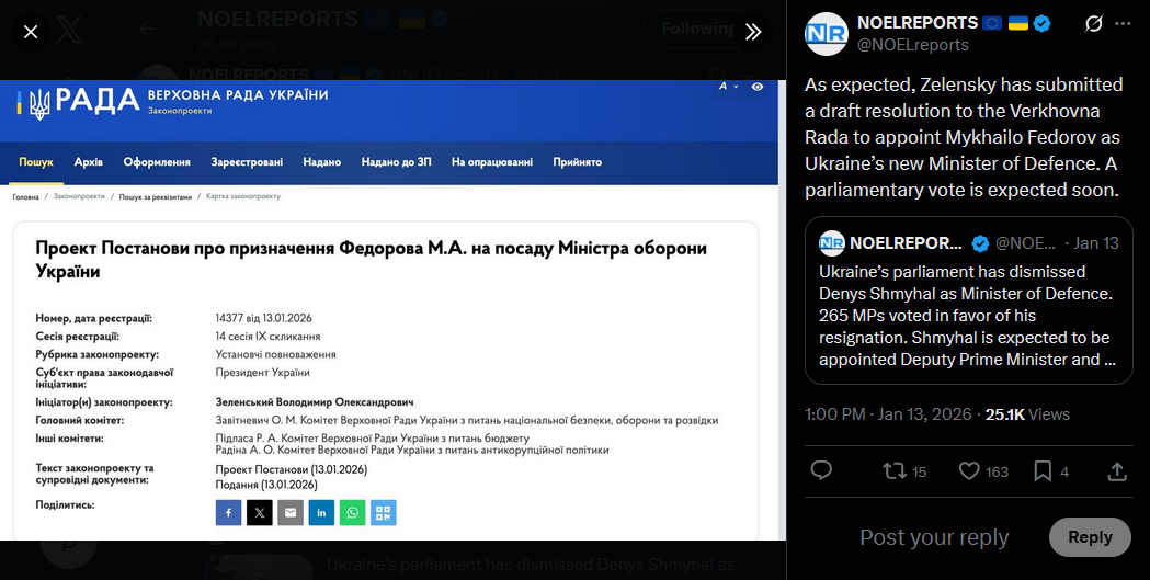 >>526065130As expected, Zelensky has submitted a draft resolution to the Verkhovna Rada to appoint Mykhailo Fedorov as Ukraine’s new Minister of Defence. A parliamentary vote is expected soon.https://x.com/NOELreports/status/2011060707329261898?s=20>13th
