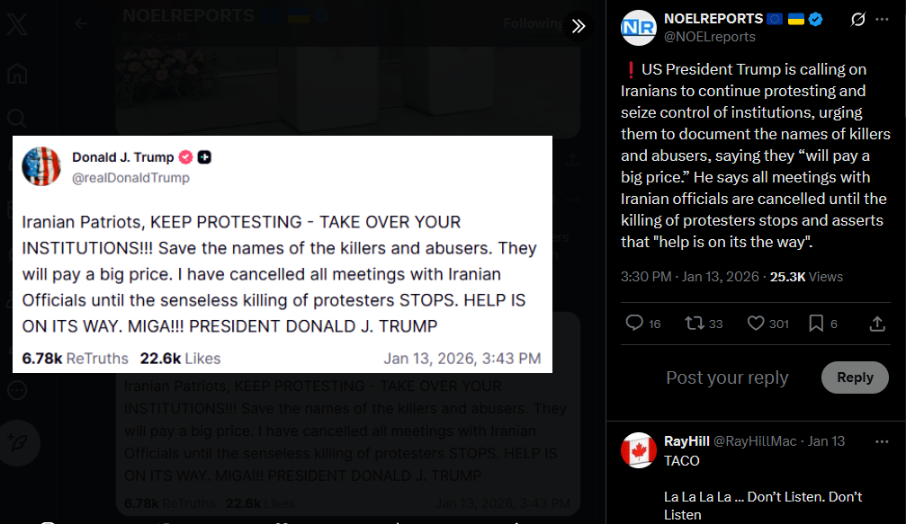 US President Trump is calling on Iranians to continue protesting and seize control of institutions, urging them to document the names of killers and abusers, saying they “will pay a big price.” He says all meetings with Iranian officials are cancelled until the killing of protesters stops and asserts that "help is on its the way".https://x.com/NOELreports/status/2011098641767764288?s=20>13th