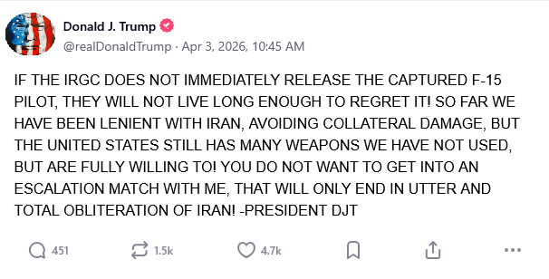 Trump confirms capture of F-15 pilot, threatens Iran