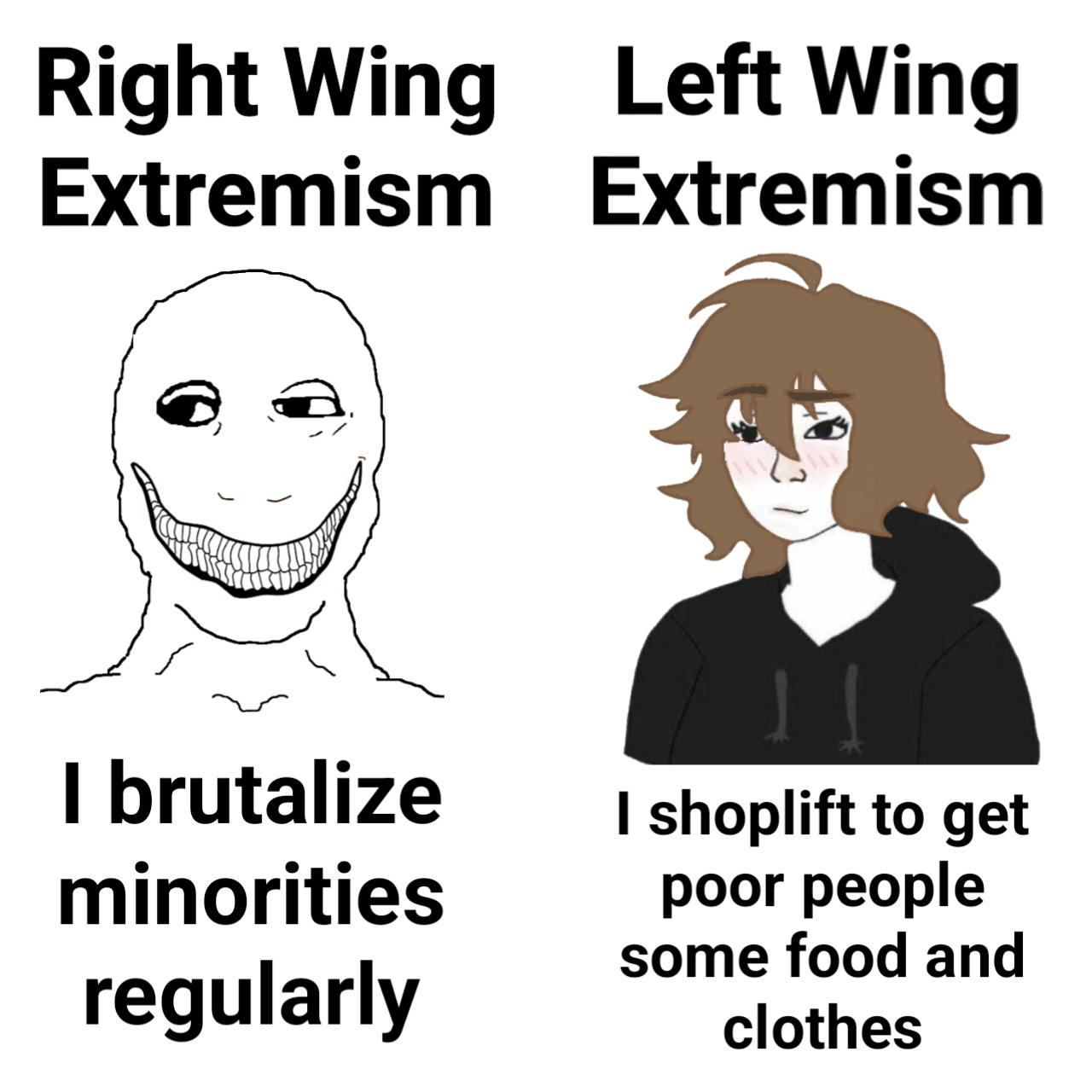 >>532287163Right wing extremist: I just wanna be left alone.Left wing extremist: I just want to brutalize people who want to be left alone