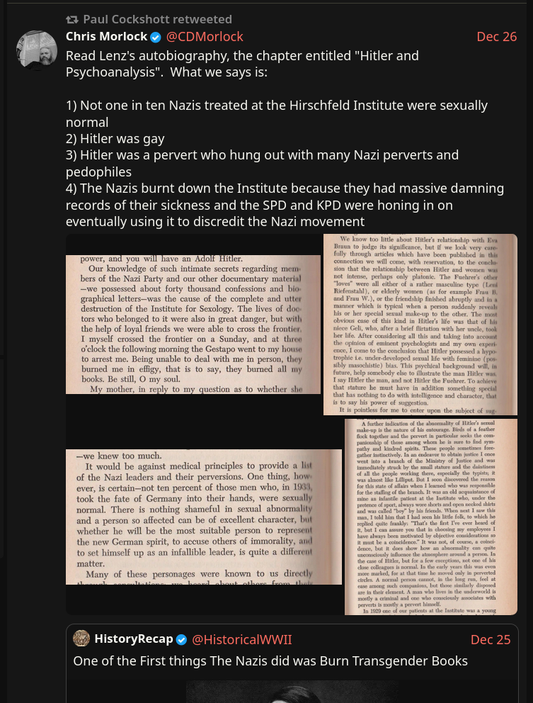 >>524661102>The masculine and feminine bothCarl Jung's last two works were about Alchemy's significance in what he had learned about human psychology. "Alchemy and Psychology" and "The Mysterium Coniunctionis" if I recall correctly. Anima/Animus, once dragged up from the depths, originating in the (sub/un)conscious refer to the understanding and incorporation of one's opposite within a given man/woman. The recognition of the union of opposites (masculine and feminine) within an individual. The union between two opposite individuals, physically, obviously leads to new life/consciousness/mind. This union is still present in the resulting polar individual, despite the physical polarity.The kikes don't just ignore the truth, they invert it. Instead of Hermeticism/Alchemy/Jung, which all retain physical polarity while embracing mental unity, they promote an inversion: trannies. Mutilate the physical body, don't bring your unconscious mind to light! Do not understand the generative principle, degenerate and destroy yourself! Prime evil.