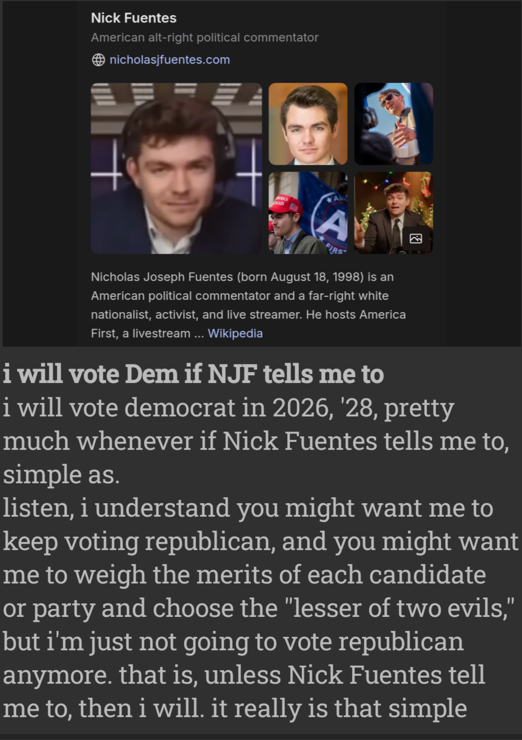 >>524671278>>524671892i will vote democrat in 2026, '28, pretty much whenever if Nick Fuentes tells me to, simple as. listen, i understand you might want me to keep voting republican, and you might want me to weigh the merits of each candidate or party and choose the "lesser of two evils," but i'm just not going to vote republican anymore. that is, unless Nick Fuentes tell me to, then i will. it really is that simple