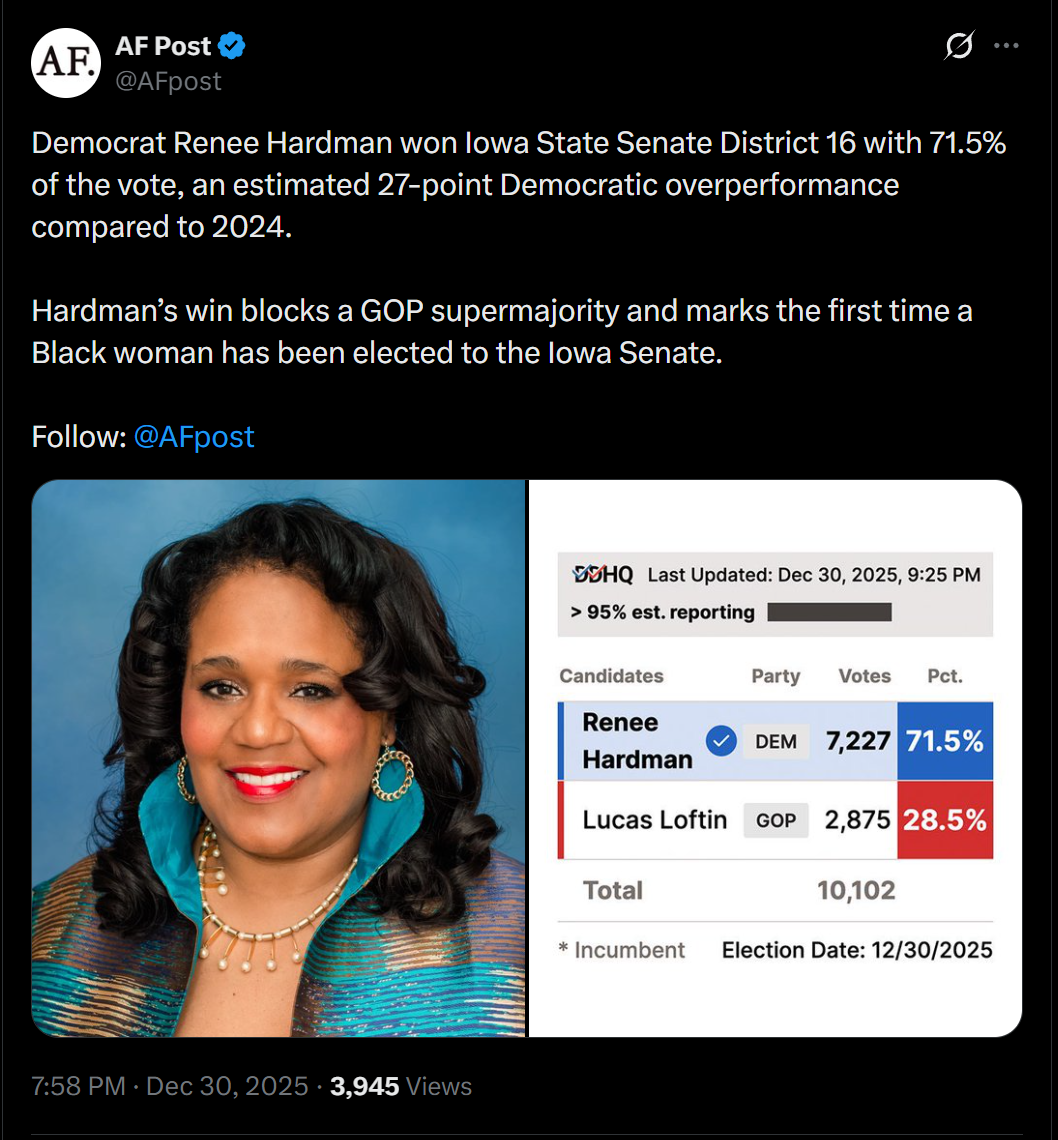 >>524679239The democrats won this seat in 2024 70%-30%. The margin is essentially unchanged. Nick Fuentes is a deep state pawn