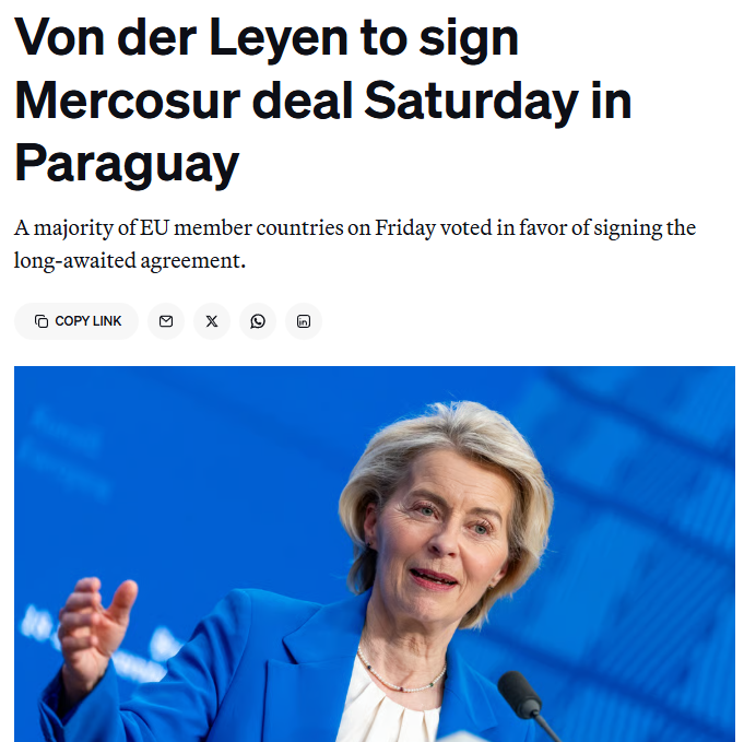 Thanks, Germany, for outskilling the french mud farmers with the junker strategy (delay the deal until the people stop chimping out, then sign it when no one is looking).Europe has signed the free trade deal with Mercosur (Brazil, Argentina, Uruguay and Paraguay).>Brazil projected to grow +2% a year>Argentina projected to grow +3 or even 4% a year>Paraguay and Uruguay projected to grow +1% yearWe are particularly happy for our argentinian friends, for whom Brazil had to do all the hard-lifting since their president used the last Mercosur summit to defend the USA practicing piracy with venezuelan ships.https://www.politico.eu/article/von-der-leyen-to-sign-mercosur-deal-saturday-in-paraguay/Von der Leyen is coming to Paraguay this saturday to sign it, while President LVLA carefully watches the dismantling of european agriculture.