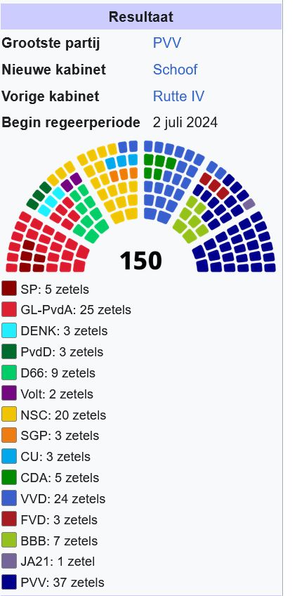 >>526157899>a majority of the votes went to Geert Wilders Freedom Partyslight correction: out of all electable parties Wilders' Freedom Party got the most votes earning them a whopping 37 seats in parliament, with the closest runner up only getting 25 seats. (pic related)>>526158230>Sounds like VVD and CDA voters got what they voted for. What youre describing is a failure of the parliamentary system, not democracy. If NL had the US system, then democracy would work better in NL. Trump wouldnt have been able to be President in 2016 if there was a parliamentary system.Not really, VVD also always promises/pretends to be hard on immigration but somehow, strangely, never is. Both CDA offshoots posited to be anti-establishment but in the end turned out to be just CDA repackaged. I didn't state democracy failed, i said it was a laughable joke told to guilable fools and it is quite clearly so: in the Netherlands we've had several referenda in which direct democracy was applied only for the outcomes to be ignored straight away by elected leadership acting directly opposite to the people's wishes.Hell even more recently, our parliament of chosen representatives voted against european digital ID only for the cabinet to ignore this entirely and agree anyway. Comment too long. Click here to view the full text.