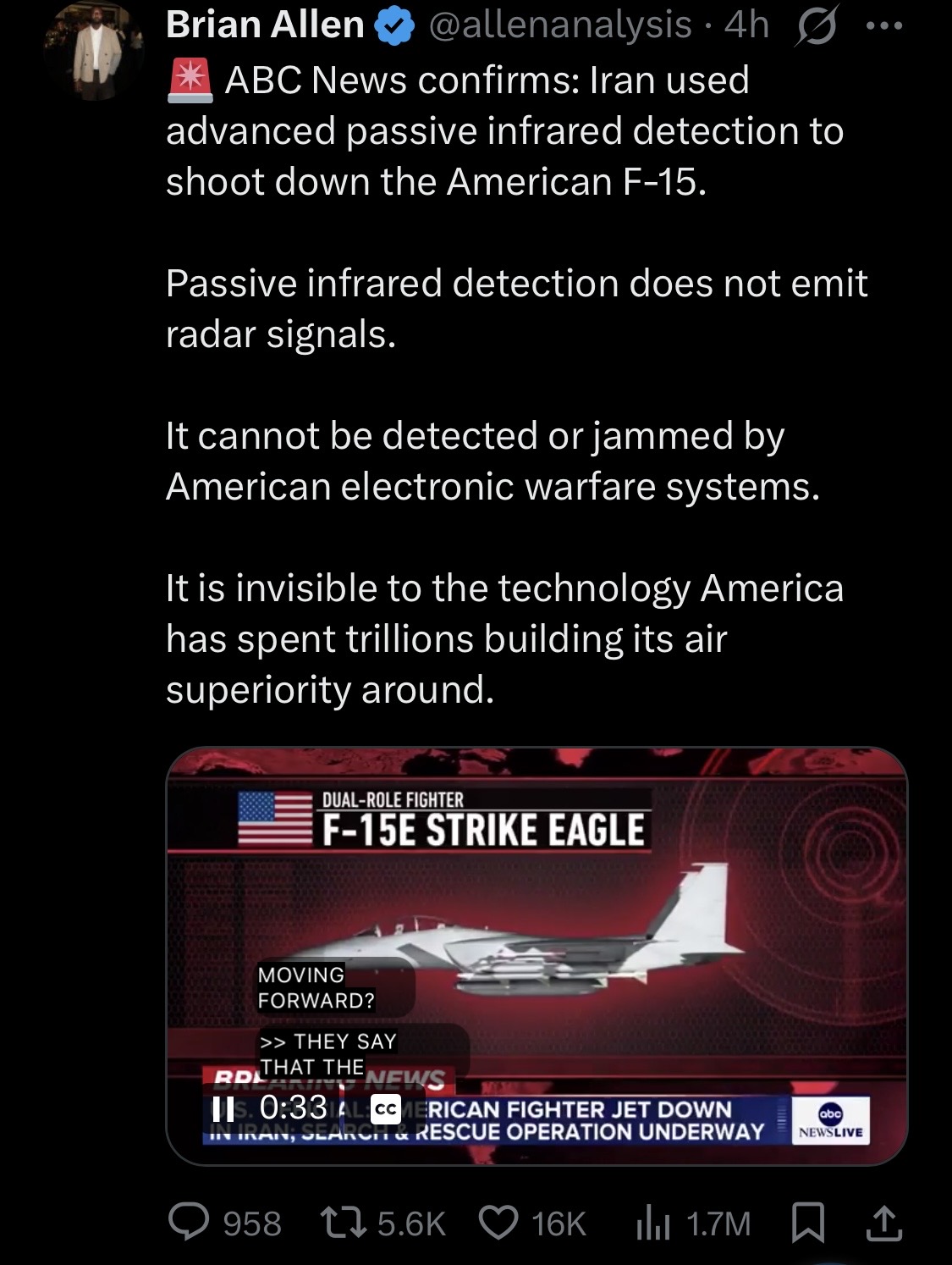 >>532331858bc we're not accomplishing the strategic objectives we stated after starting the war:1. IRGC not destroyed/no regime change2. nuclear enriched uranium not recovered 3. Iran's ballistic missile/drone threat still present4. Strait of Hormuz now closed (lol)The only thing we've done is destroy their outdated Navy/Air Force which was largely made up of decades old relics. Oh and we killed the moderate leaders and now hardliners are in charge. "B-but what about the 10k bombs we've dropped anon!" We dropped more bombs on Vietnam than all the allies did on Germany in WWII combined but we still lost the war bc we didn't complete our objective of destroying the communist threat in North Vietnam. You don't win wars by scoring more points than the other side, it's not a football game.