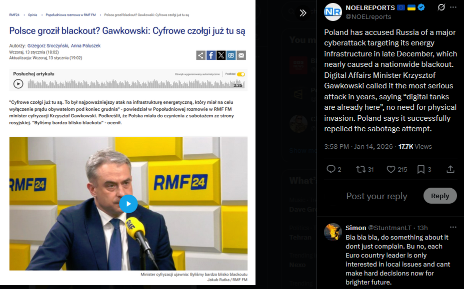 Poland has accused Russia of a major cyberattack targeting its energy infrastructure in late December, which nearly caused a nationwide blackout. Digital Affairs Minister Krzysztof Gawkowski called it the most serious attack in years, saying “digital tanks are already here”, no need for physical invasion. Poland says it successfully repelled the sabotage attempt.https://x.com/NOELreports/status/2011468041872191592?s=20>21h