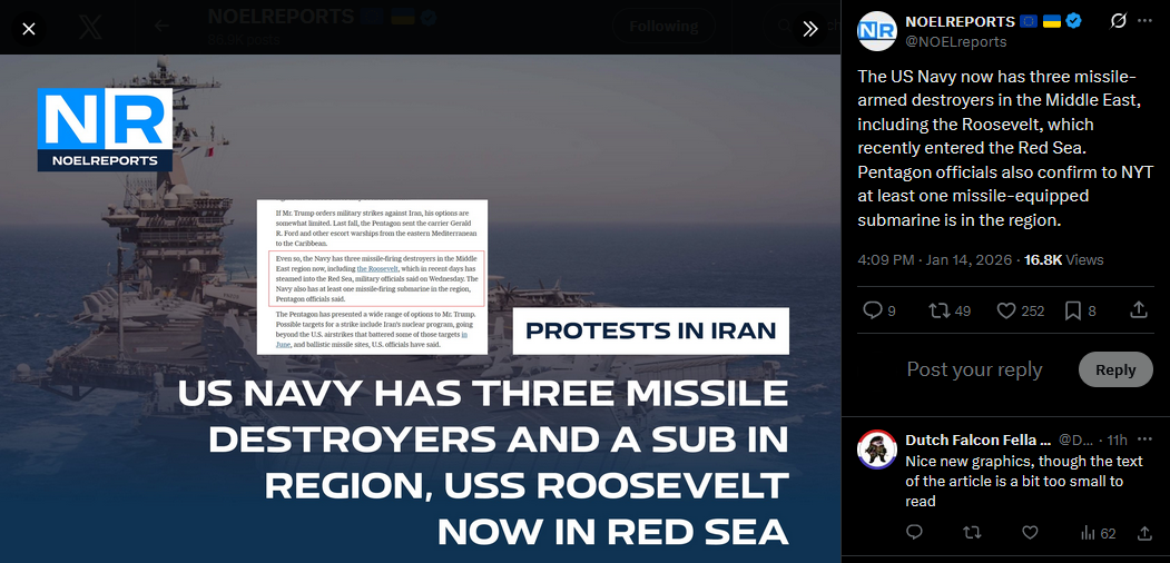>>526069893The US Navy now has three missile-armed destroyers in the Middle East, including the Roosevelt, which recently entered the Red Sea. Pentagon officials also confirm to NYT at least one missile-equipped submarine is in the region.https://x.com/NOELreports/status/2011470745365340344?s=20>20h