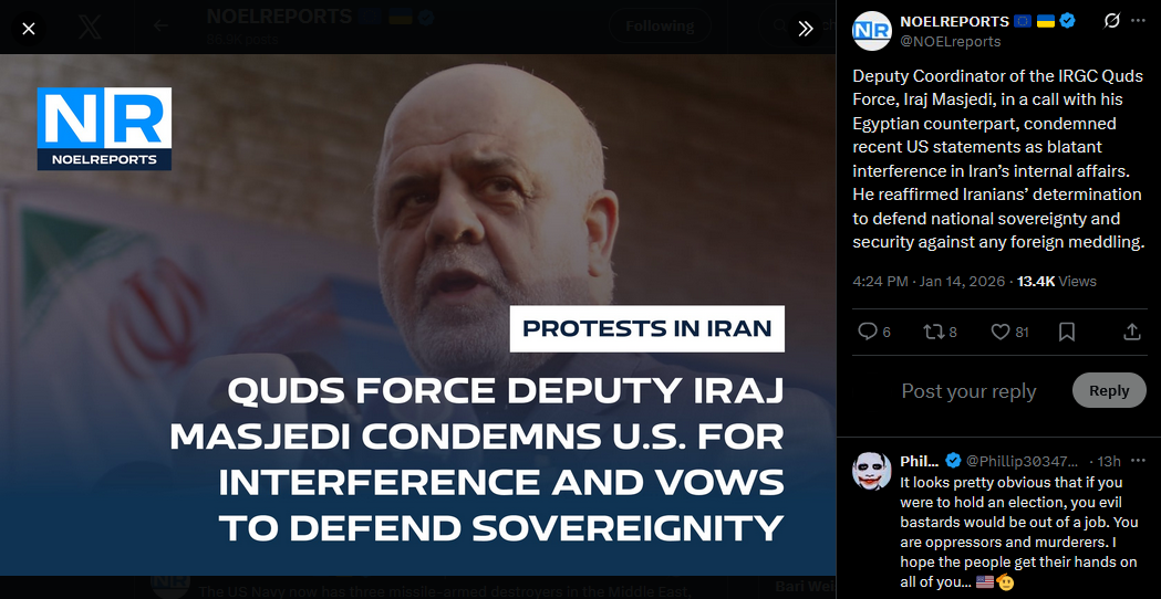 >>526069994Deputy Coordinator of the IRGC Quds Force, Iraj Masjedi, in a call with his Egyptian counterpart, condemned recent US statements as blatant interference in Iran’s internal affairs. He reaffirmed Iranians’ determination to defend national sovereignty and security against any foreign meddling.https://x.com/NOELreports/status/2011474464483967460?s=20>20h