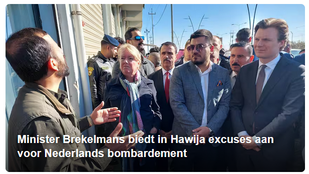 Outgoing defense minister ruben brekelmans personally apologized in Hawija, Iraq, on thursday for the bombing of the city in 2015. At least seventy civilians were killed in the Dutch airstrike.We are such losers!> Outgoing defense minster travels to Iraq to apologizeWhich other county does this?Ministry of defense has paid 4 million and 10million to Iraq.> Probably all that money has ended in the hands of terrorist networksWhich will result in attacks on european soil.If I was an Iraqi citizen I would arrest this minister and put his ass on trial.
