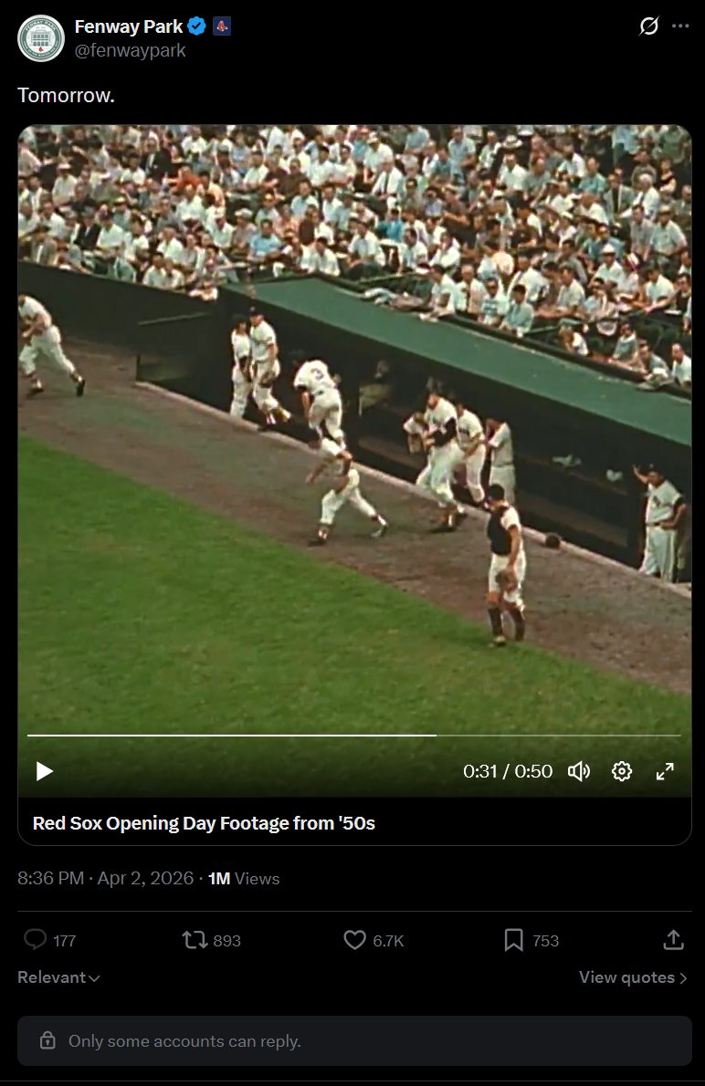 Boston's Fenway Park account disables comments after they post a video of 1950s opening day crowd.https://x.com/fenwaypark/status/2039864569095471607