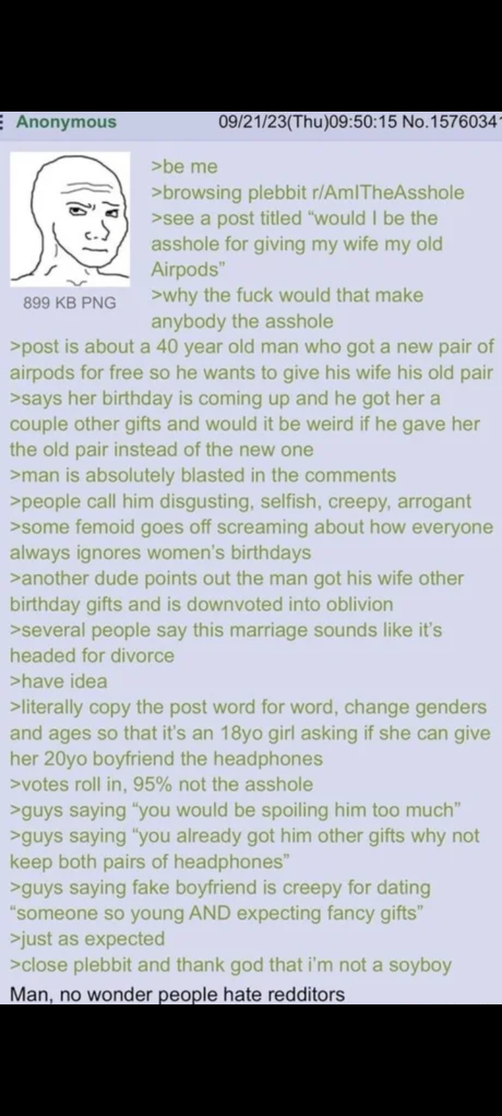 >>525894725I cringed so fucking hard reading the OP pic. First off, there's a very big difference between purchasing parity, responsibilities, experience, and authority between a 30 year old man and an 18 year old woman. The 30 year old man at that point in his life should be well established, working a decent career, with a decent income, at the bare minimum. The fact that he is married should suggest this. Giving your wife your 2 year old crusty airpods with 75% battery health as a half assed last minute present and then trying to paint it as "Look! I did something! That should count!" is low. Looking over apple's website I see that the airpods swing from $179 to about $249, before taxes and shipping. Don't even bother looking at the cheapest option, you should be able to afford to splurge ~$270 as a present on your significant other at that point in your life. Not look for cheap excuses for last minute present ideas, which is why those people on reddit are rightfully disgusted at the idea.Now, when an 18 year old woman offers her old airpods to her ~20 something year old boyfriend it's endearing because she is just starting out her life, and might even still be in highschool, working at a a shit job where the weekly paychecks barely clear $200 part time. So those 2 year old airpods are still a relatively expensive item for her to own, and to offer them up to her boyfriend rather than sell them, is seen as endearing. And then there's just the fact that someone went and inverted the genders and ages of the original story as a kind of shitty "aha! gotcha!" to make themselves feel better and prove something to themselves.