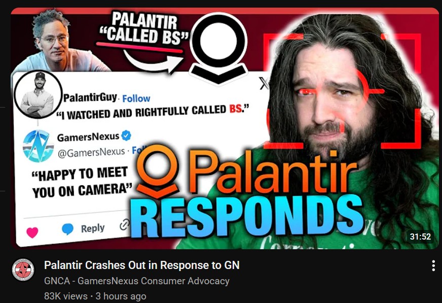 Our guy Steve from Gamers Nexus (aka Tech Jesus) is singlehandedly taking the fight to Zion Don and his Mossad police state surveillance apparatus, Palantir.Thoughts, /pol/?