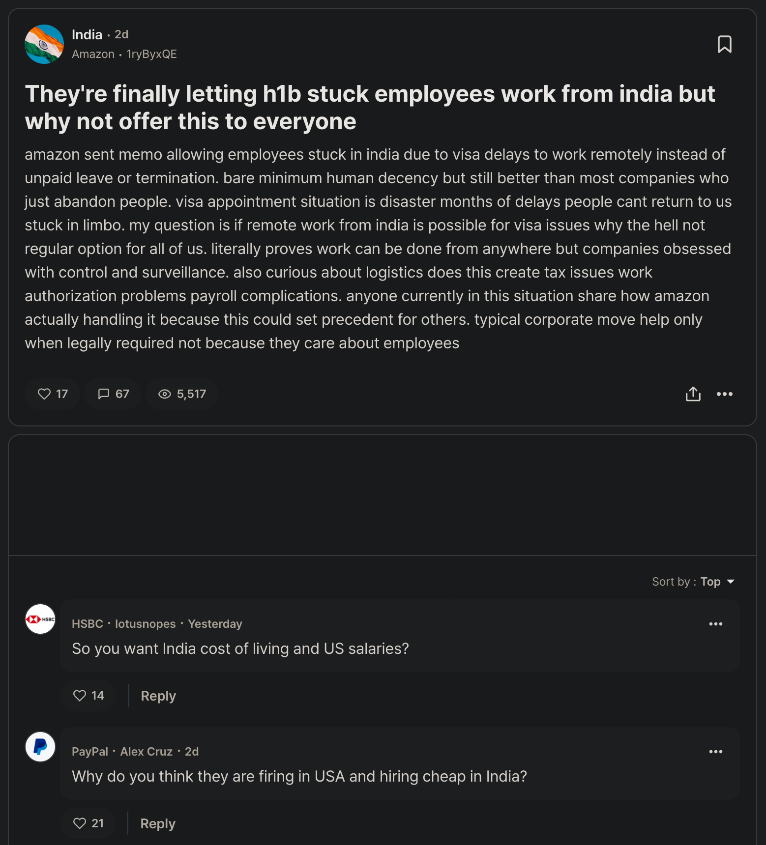 >be me>American citizen, 8 years at Amazon>Nov 'restructuring' - 2 weeks severance, escorted out>see leak: H1B workers 'stuck' in India get to work remotely>on FULL US salary ($300k+) until March>same managers who threatened my team with RTO>same teams that 'couldn't function' without daily standupsThe kicker? They're BANNED from coding, testing, documentation, customer interaction, strategic decisions, contract negotiations, and team management.So let me get this straight: while citizens get 2-week severance, visa workers get 3 months of paid vacation disguised as 'remote work'?If they can't code, can't talk to customers, can't make decisions, and can't manage teams - what exactly are they doing to earn $300k? Garden leave for 'exceptional talent' while citizens get shown the door?https://youtu.be/kq1jFuLoA7g
