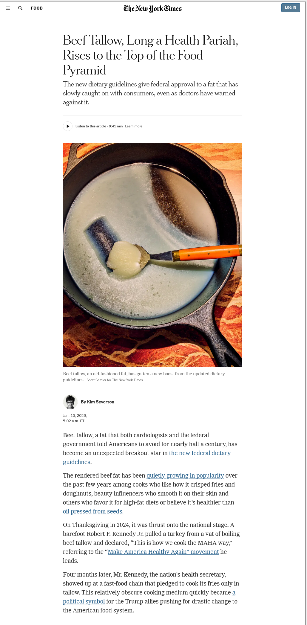 lolwut> The new dietary guidelines give federal approval to a fat that has slowly caught on with consumers, even as doctors have warned against it.> Beef tallow, a fat that both cardiologists and the federal government told Americans to avoid for nearly half a century, has become an unexpected breakout star in the new federal dietary guidelines.> The rendered beef fat has been quietly growing in popularity over the past few years among cooks who like how it crisped fries and doughnuts, beauty influencers who smooth it on their skin and others who favor it for high-fat diets or believe it’s healthier than oil pressed from seeds.> On Thanksgiving in 2024, it was thrust onto the national stage. A barefoot Robert F. Kennedy Jr. pulled a turkey from a vat of boiling beef tallow and declared, “This is how we cook the MAHA way,” referring to the “Make America Healthy Again” movement he leads.> Four months later, Mr. Kennedy, the nation’s health secretary, showed up at a fast-food chain that pledged to cook its fries only in tallow. This relatively obscure cooking medium quickly became a political symbol for the Trump allies pushing for drastic change to the American food system.the push for this feels too much like mainlining bacon grease into my arteriesLike the grease in the rug at the Golden Corral.Source: https://www.nytimes.com/2026/01/10/dining/beef-tallow-food-pyramid-rfk-jr.htmlArchive: https://archive.is/jGCgV