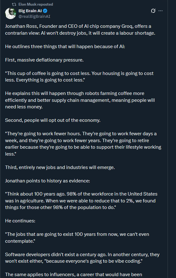 First, massive deflationary pressure."This cup of coffee is going to cost less. Your housing is going to cost less. Everything is going to cost less."He explains this will happen through robots farming coffee more efficiently and better supply chain management, meaning people will need less money.Second, people will opt out of the economy."They're going to work fewer hours. They're going to work fewer days a week, and they're going to work fewer years. They're going to retire earlier because they're going to be able to support their lifestyle working less."Third, entirely new jobs and industries will emerge.Jonathan points to history as evidence:"Think about 100 years ago. 98% of the workforce in the United States was in agriculture. When we were able to reduce that to 2%, we found things for those other 98% of the population to do."Comment too long. Click here to view the full text.
