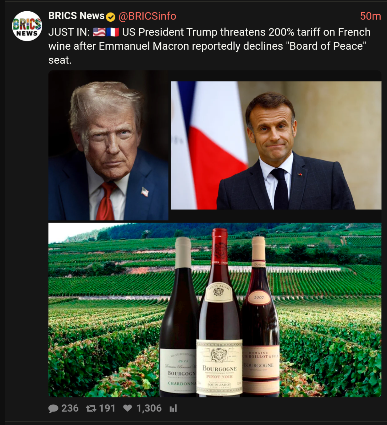 US President Trump threatens 200% tariff on French wine after Emmanuel Macron reportedly declines "Board of Peace" seat.