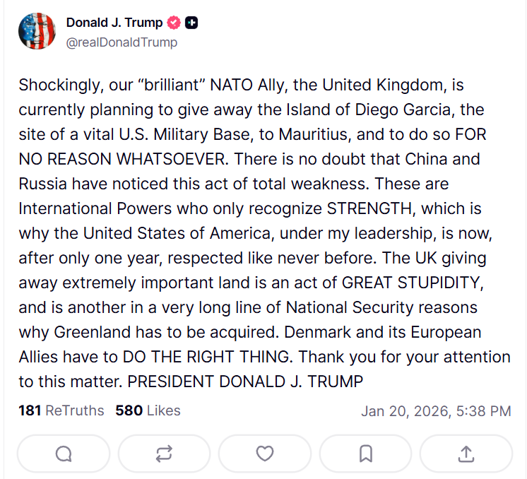 https://truthsocial.com/@realDonaldTrump/115926047595803521Trump says the UK is giving away an island and is increasingly threatening to invade the UK to keep a US military base on it