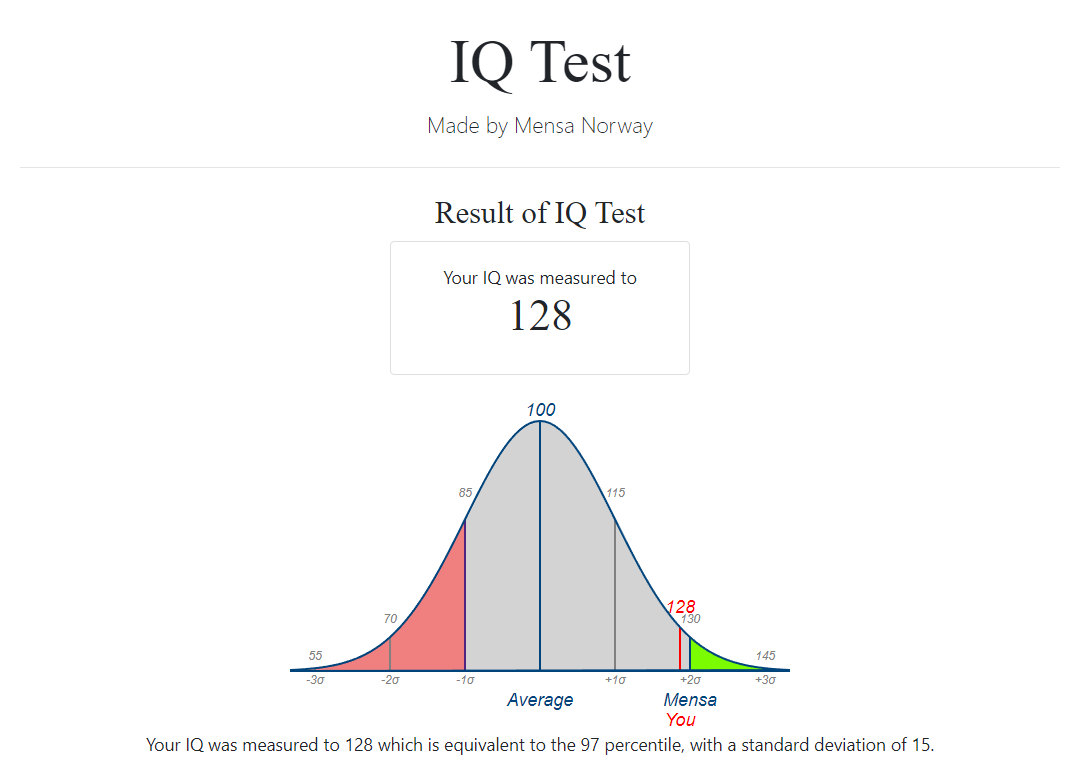Post your IQ test scores.https://testyourself.psychtests.com/https://wonderlictestpractice.com/https://test.mensa.no/Home/Test/en-UShttps://planning.e-psychometrics.com/test/icar60https://www.test-iq.org/free-iq-test/https://www.free-iqtest.net/https://www.iqtestexperts.com/Comment too long. Click here to view the full text.